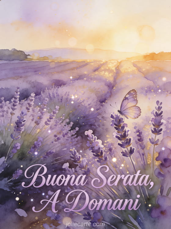 Condividi belle immagini di buona serata a domani con un tranquillo campo di lavanda all'ora dorata con una farfalla, fiori viola che si estendono all'orizzonte in una serena atmosfera serale della Provenza. Scopri anche una cartolina buonanotte a domani citazione, un gif buona serata buonanotte a domani o una cartolina buona sera baci a domani.