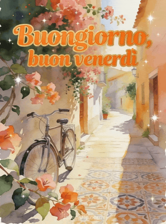 Condividi un messaggio soleggiato di buongiorno e buon venerdì con una bicicletta vintage, bouganville in fiore e un vicolo luminoso di villaggio. Puoi inviare anche buon venerdì baci gif, immagini augurando un venerdì musulmano benedetto o immagini che augurano un buon venerdì.