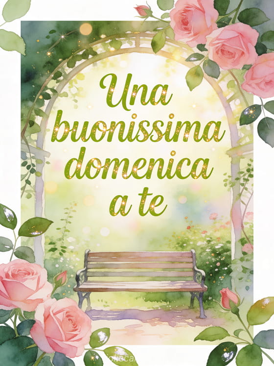 Condividi un biglietto calmo di buona domenica con una panchina da giardino, un arco di luce, rose rosa e foglie lucide in un delicato acquerello. Puoi anche inviare buona domenica amici immagini, una buona domenica bouquet di fiori immagine o una buona domenica immagine grigia.