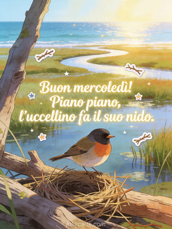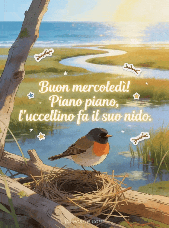 Buon mercoledì! Piano piano, l'uccellino fa il suo nido. una frase serena di metà settimana ispirata alla natura