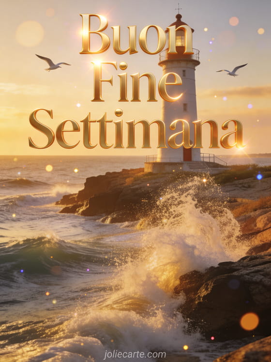 Invia un'immagine di buon fine settimana e illumina la giornata di qualcuno. Un faro incantevole su una costa rocciosa al tramonto crea l'atmosfera perfetta. Scopri anche un gif animato fine settimana umorismo o una cartolina buon fine settimana.