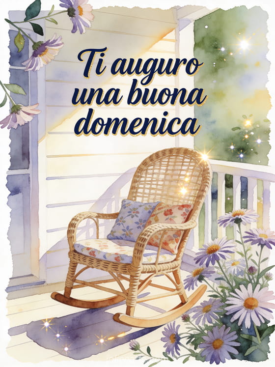 Invia un saluto sereno di buona domenica con una sedia a dondolo in vimini accanto a fiori di aster su un portico luminoso, con cuscini morbidi e luce scintillante della domenica. Scopri anche una immagine animata di buona domenica, un buona domenica amici gif o un buona domenica spiaggia gif.