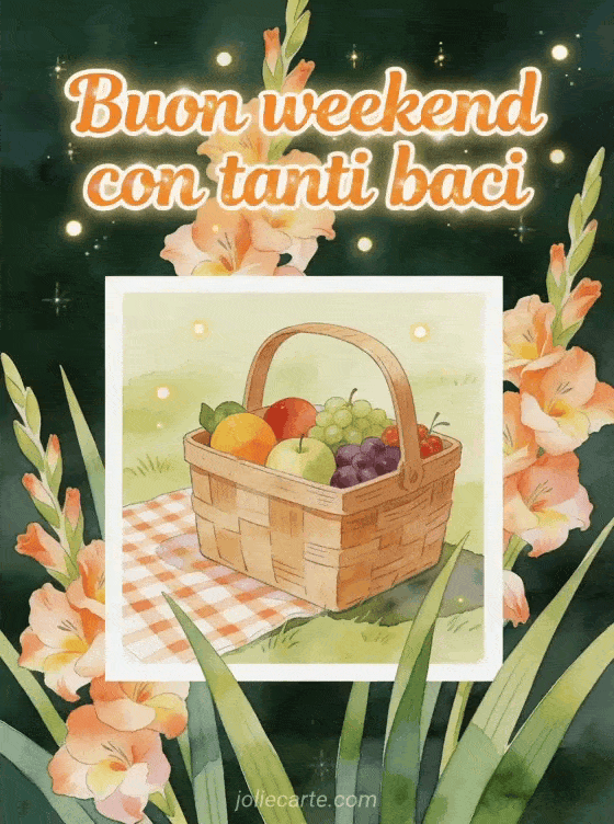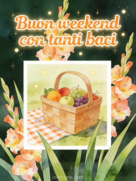 Condividi baci del weekend con una cartolina ad acquerello piena di gladioli, un cestino da mercato con frutta e una tovaglia da picnic allegra in luce dorata. Puoi anche inviare buon fine settimana baci gif, condividere passa un buon weekend baci o scegliere tenerezza buon weekend baci.