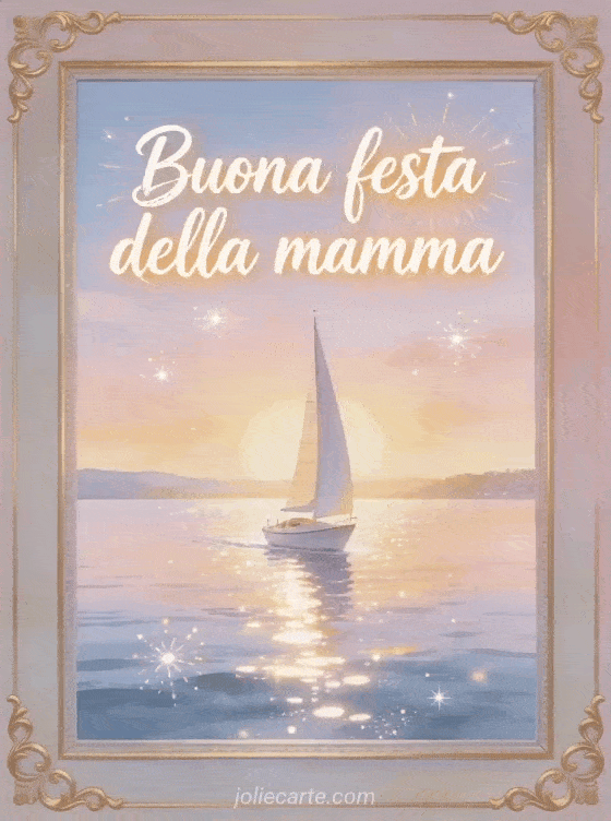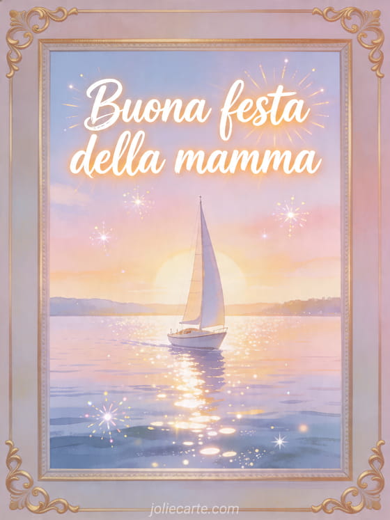 Invia immagini gratuite per la festa della mamma con una scritta bianca leggera, un panorama di lago scintillante e una barca a vela elegante sotto un'alba pastello. Questo biglietto illustrato e sereno porta calma, luce e affetto. Scopri anche festa della mamma testo, biglietto con cuore festa della mamma o una poesia d'amore per la festa della mamma.