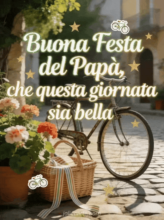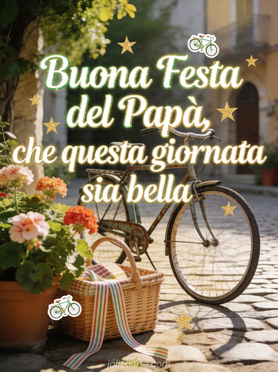 Condividi immagini gratuite per la Festa del PapĂ con elegante scritta color crema, piccoli adesivi di biciclette e stelle, una bicicletta vintage accanto a un geranio in fiore, cestino da picnic, nastro a righe e ciottoli illuminati dal sole. Scopri anche buona festa del papĂ a mio zio, buona domenica della festa del papĂ o buona festa papĂ .
