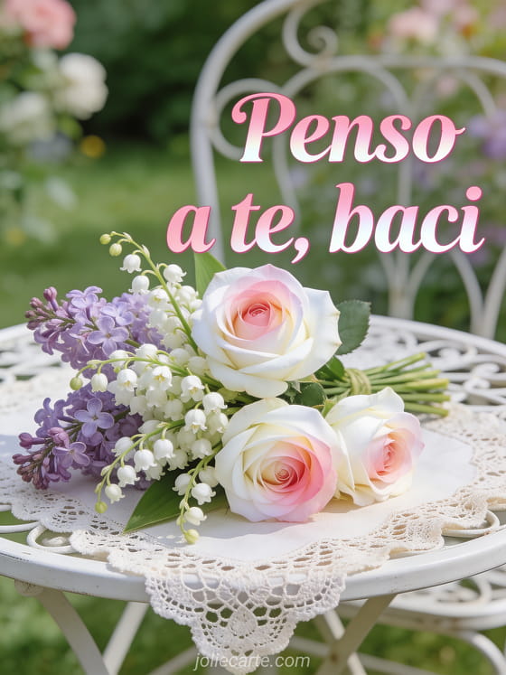 Invia questa bella cartolina con mughetto e lilla per far sentire la tua tenerezza. Scopri anche una cartolina ti penso ti amo o una cartolina messaggio d'amore penso a te tesoro mio.