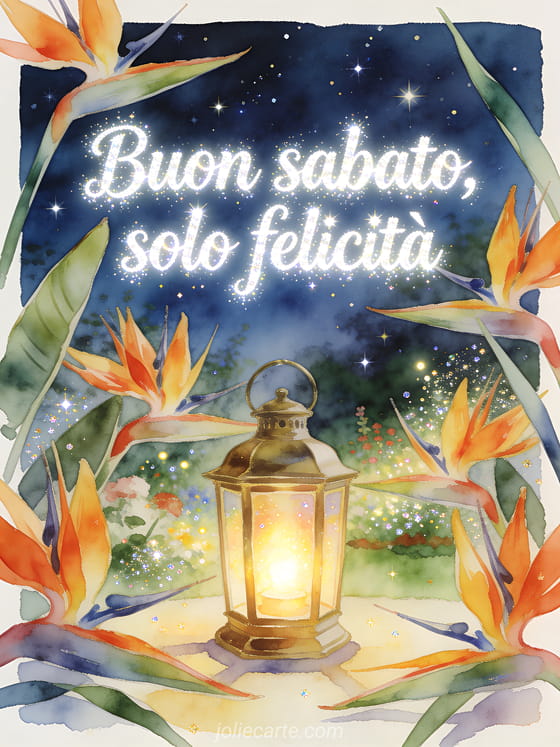 Condividi un messaggio gioioso di buon sabato con una lanterna in ottone che brilla tra vividi fiori di strelitzia sotto piccole luci simili a stelle. Scopri anche buon sabato gif scintillanti, immagine per augurare un buon sabato o buon sabato soleggiato gif.
