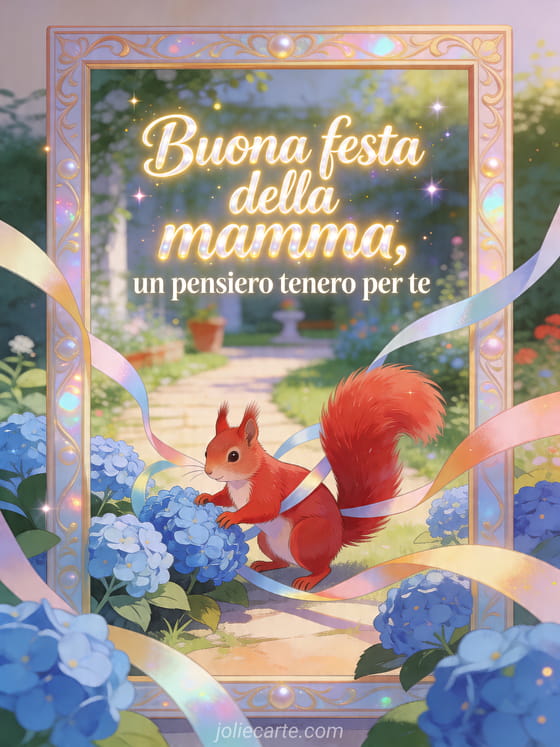 Condividi un pensiero delicato per la festa della mamma con un biglietto illustrato gioioso, ricco di ortensie blu, nastri e luce scintillante. Scopri anche una lirica della festa della mamma, un complimento per la festa della mamma o come augurare buona festa della mamma alla tua mamma.