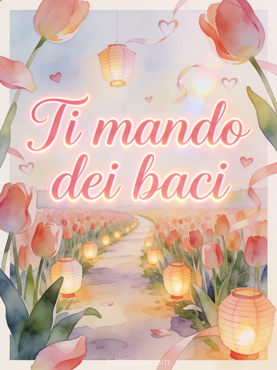 Invia un saluto tenero di baci con scritta rosa leggera e bordi luminosi. Questa cartolina gratuita segue un sentiero di tulipani ad acquerello con lanterne di carta accese, nastri a cuore sospesi e luce calda. Scopri anche un marmotta baci gif, un baci con tenerezza gif o un baci farfalla gif.