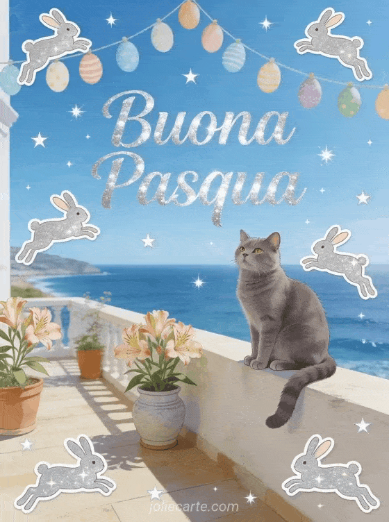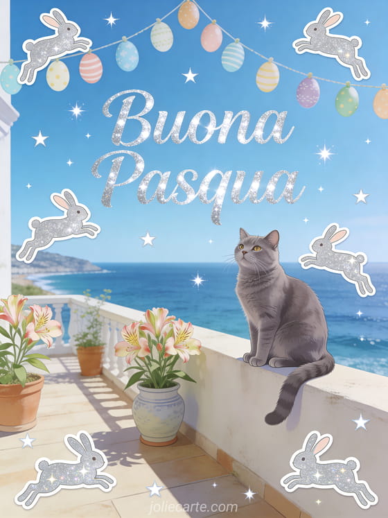 Un gatto certosino seduto regalmente sul muro di una terrazza vista mare con alstroemeria in vasi di ceramica e ghirlande di uova di Pasqua — un elegante invito virtuale di Pasqua. Scopri anche una immagine coniglio di Pasqua, una cartolina Pasqua gratis o un testo biglietto auguri Pasqua.