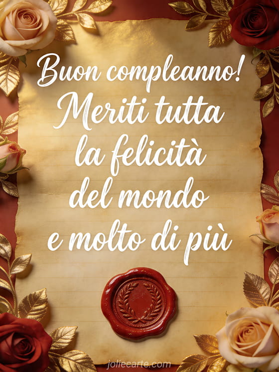 Condividi un commovente messaggio di compleanno con questo elegante biglietto creato come una lettera dorata con rose, foglie e un sigillo rosso di cera. Scopri anche bouquet di fiori buon compleanno, augurare buon compleanno a distanza e buon compleanno condividi su facebook.
