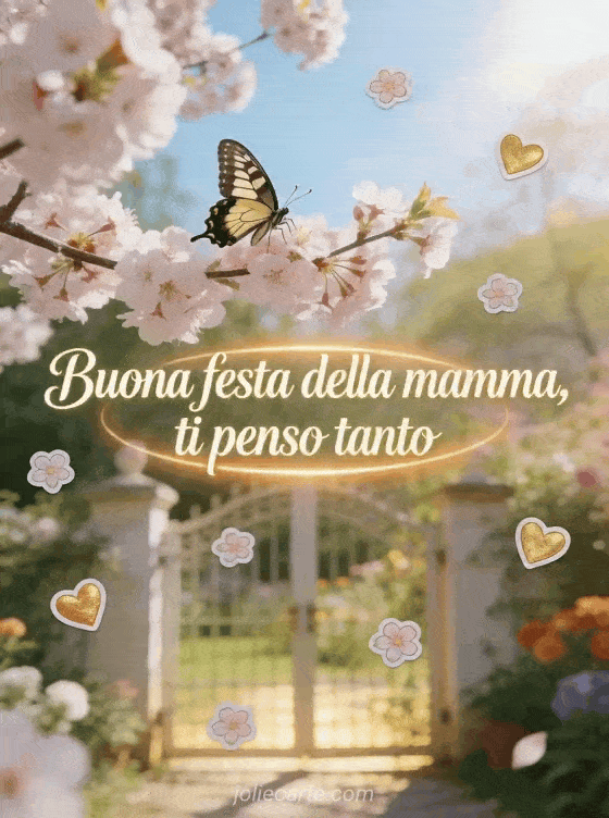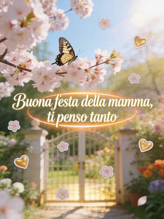 Condividi liriche per la festa della mamma con raffinato corsivo color crema, piccoli fiori, cuori dorati e una farfalla macaone su un ramo di fiore di ciliegio sopra un cancello da giardino al sole. Questo biglietto elegante dice ti penso tanto. Scopri anche buona festa della mamma a una futura mamma, biglietti festa della mamma o messaggio di buona festa della mamma.