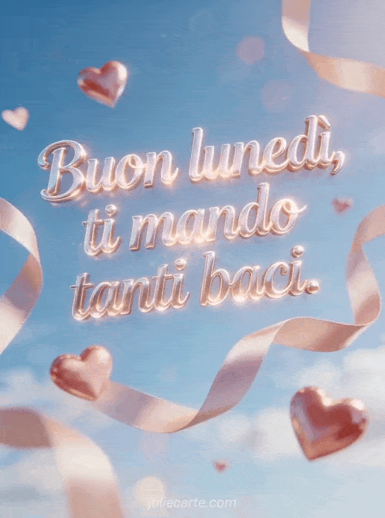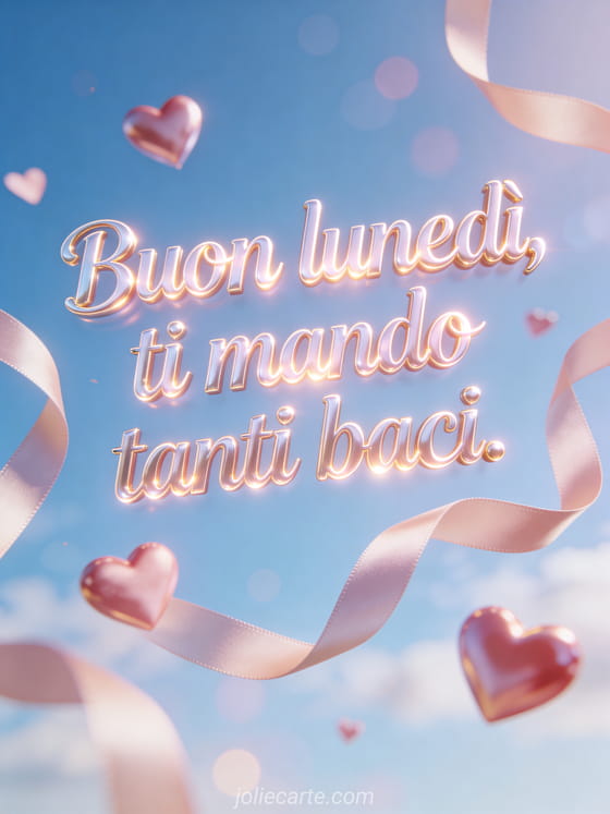 Condividi lunedì baci con scritte romantiche lucide, cuori sospesi e nastri di raso in un cielo luminoso con bokeh morbido. Puoi inviare anche buon lunedì cartoline, gif buon lunedì buona settimana o buon lunedì immagine animata.