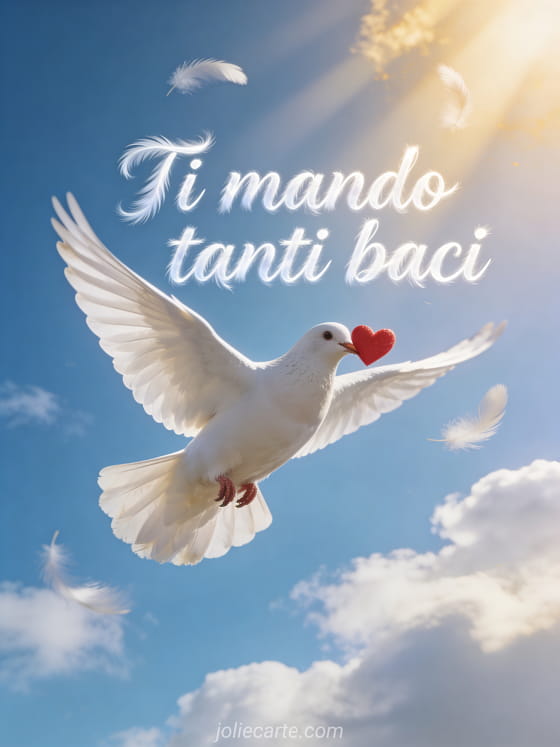 Invia i tuoi baci con questa luminosa cartolina gratuita con una colomba bianca in volo che porta un piccolo cuore rosso nel becco contro un cielo azzurro con raggi di sole dorati. Scopri anche una cartolina baci e caffè immagine o una cartolina inviare baci.