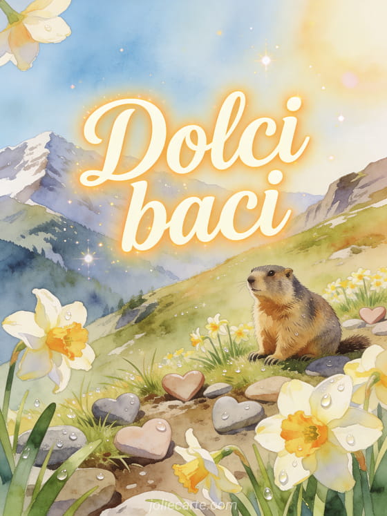 Invia un saluto tenero di dolci baci con una marmotta seduta su un pendio alpino tra narcisi, erba fresca e ciottoli a forma di cuore nei colori soleggiati della montagna. Scopri anche un baci con tenerezza gif, un baci farfalla gif o immagine piena di baci.