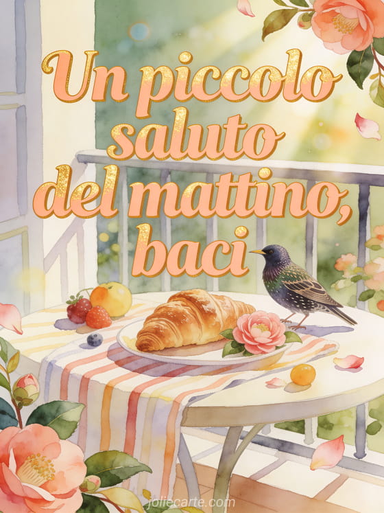 Condividi un piccolo saluto luminoso del mattino con questo biglietto ad acquerello, con uno storno accanto a un croissant sfogliato, camelie, frutta fresca, tessuto a righe e sole sul balcone. Scopri anche ciao baci buon risveglio gif animate, ciao viola o ciao buongiorno amica mia.