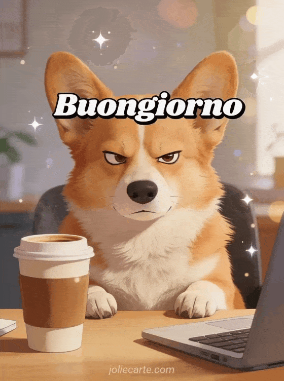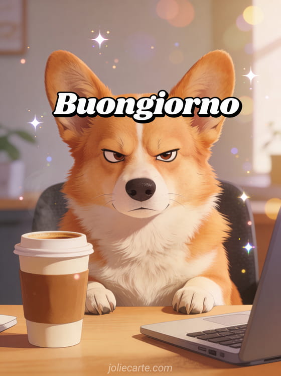 Meme buongiorno un saluto buongiorno in stile meme con un corgi dall'aria sospettosa alla sua scrivania con caffè