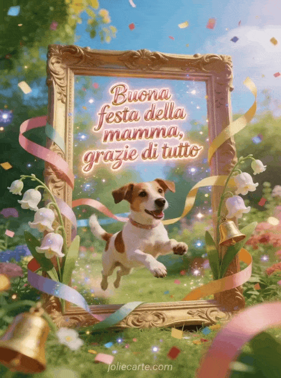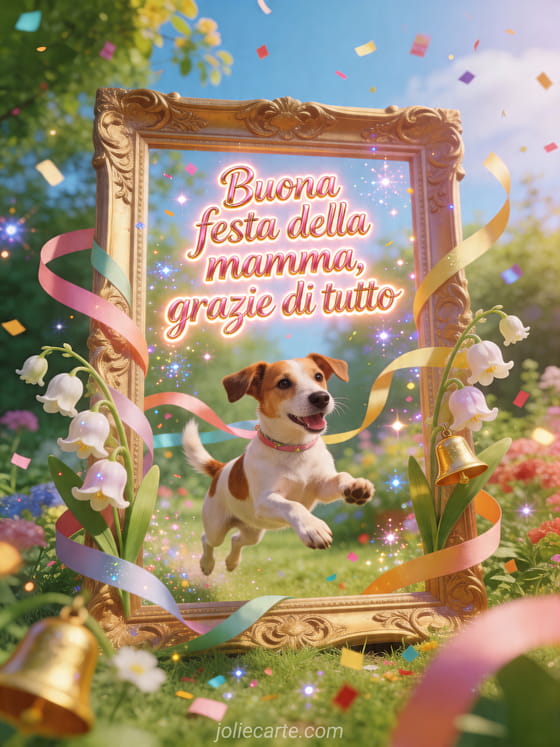 Condividi un biglietto giocoso per la festa della mamma che dice grazie di tutto, con un Jack Russell che salta tra nastri e campanule intorno a una cornice dorata da giardino. Scopri anche una poesia per la festa della mamma, immagini per la festa della mamma o poesie della festa della mamma.