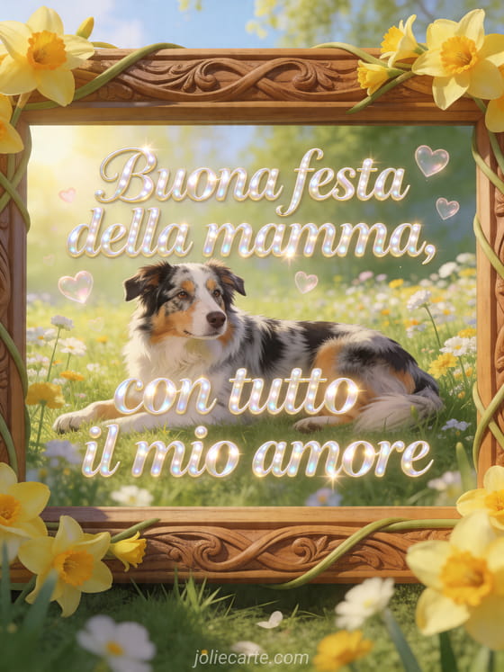 Condividi un biglietto amorevole per la festa della mamma con un pastore australiano realistico che riposa in un prato fiorito, incorniciato da legno intagliato, narcisi e cuori fluttuanti. Scopri anche poesia festa della mamma baci, una cartolina festa della mamma o una buona festa della mamma super mamma.