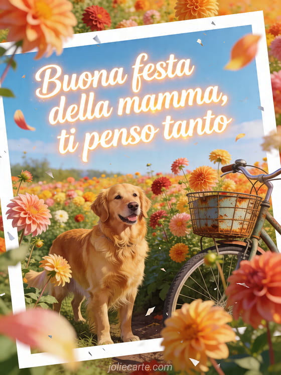 Condividi messaggi sulla festa della mamma in un biglietto realistico e assolato con un cane golden retriever in un prato di dalie accanto a un cestino da bicicletta vintage. Scopri anche fotografia della festa della mamma, un disegno per la festa della mamma o parole dolci per la festa della mamma.