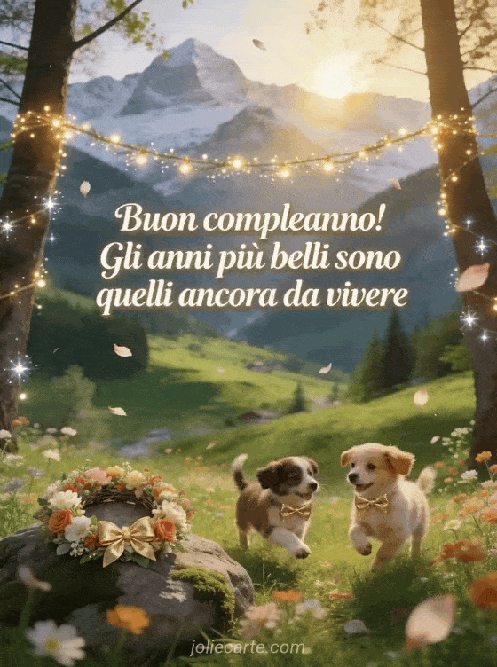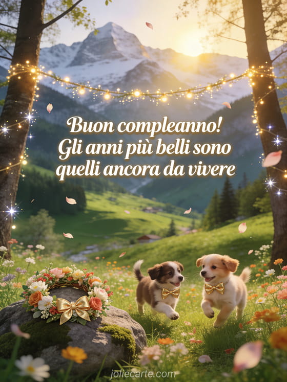 Buon compleanno! Gli anni più belli sono quelli ancora da vivere Un messaggio caldo e pieno di speranza in un luminoso paesaggio alpino di primavera.