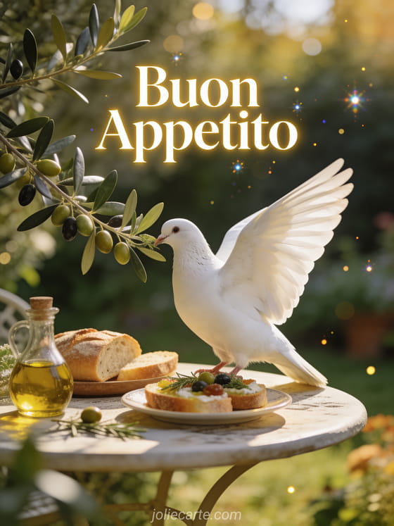 Condividi un elegante saluto di buon appetito con questa cartolina con colomba bianca e tavola mediterranea. Scopri anche una cartolina buon appetito o una cartolina gif buon appetito baci.