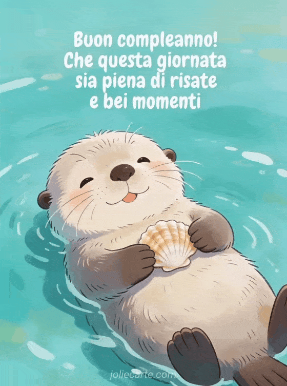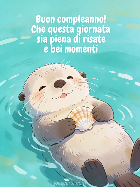 Condividi un biglietto marino e divertente di compleanno con una lontra tranquilla che galleggia sul dorso nell'acqua turchese, tenendo una conchiglia tra le zampe. Scopri anche un buon compleanno buon compleanno mio figlio, un sms per augurare buon compleanno a mio figlio o un biglietto di compleanno mio figlio.