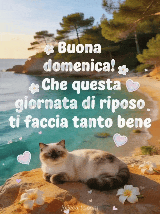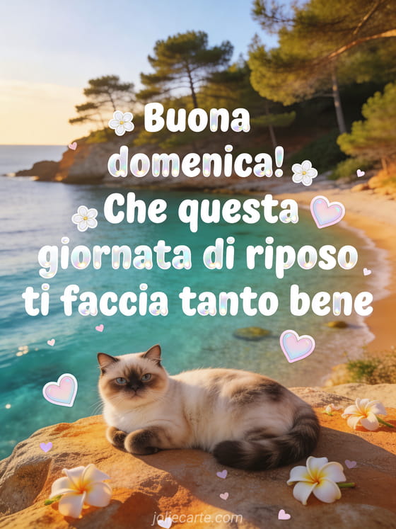 Invia un messaggio caloroso di buona domenica con lettere bianche arrotondate, fiorellini, cuori pastello, una cala turchese con pini mediterranei e un gatto exotic shorthair disteso su una roccia calda. Puoi vedere anche questa cartolina virtuale ciao buona domenica, questa buona domenica gif animata o queste belle immagini buona domenica baci.