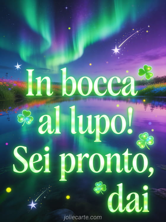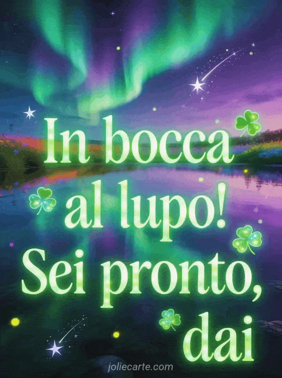Condividi questo magico biglietto con aurora boreale per incoraggiare qualcuno prima del suo colloquio di lavoro. Scopri anche una cartolina animata buona fortuna o un messaggio buona fortuna concorso.