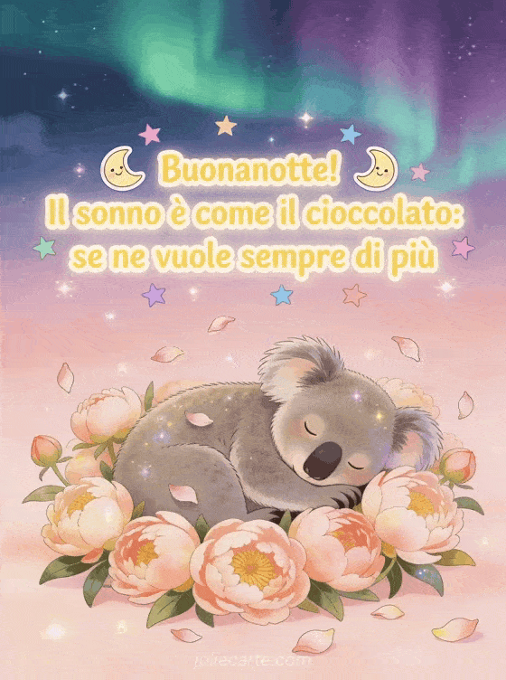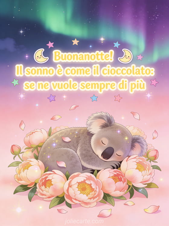 Condividi una risata prima di dormire con questo biglietto divertente con un koala addormentato tra peonie sotto un cielo di aurora boreale rosa e verde con un simpatico messaggio sul sonno e il cioccolato. Scopri anche foto della buona notte, un pensiero della buona notte o un messaggio buonanotte carino.