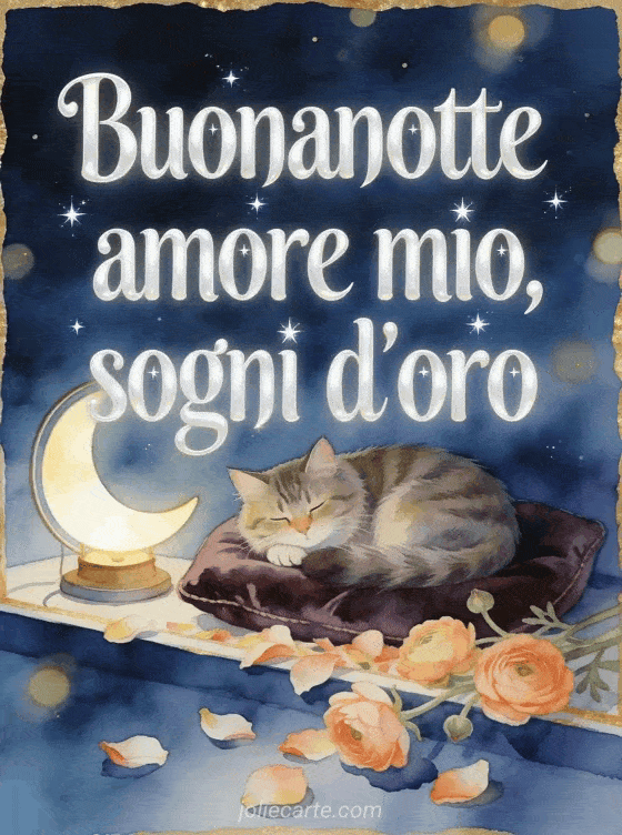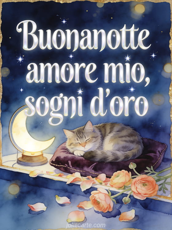 Condividi un messaggio d'amore di buonanotte con un gatto norvegese delle foreste su un cuscino di velluto, una lampada a mezzaluna e petali di ranuncolo. Scopri anche un messaggio per dire buona notte al proprio amore, un biglietto per dire buona notte o una cartolina virtuale animata buonanotte.