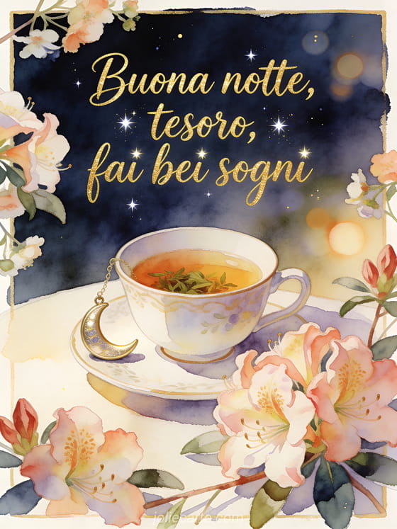 Condividi un caldo messaggio di buonanotte tesoro con una tazza di porcellana con tisana, un ornamento a luna crescente e fiori di rododendro in acquerello. Scopri anche messaggio di augurio di buona notte, buona serata buona notte biglietto o cartolina online buonanotte.