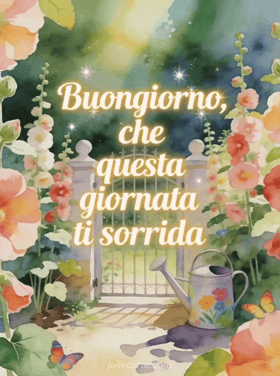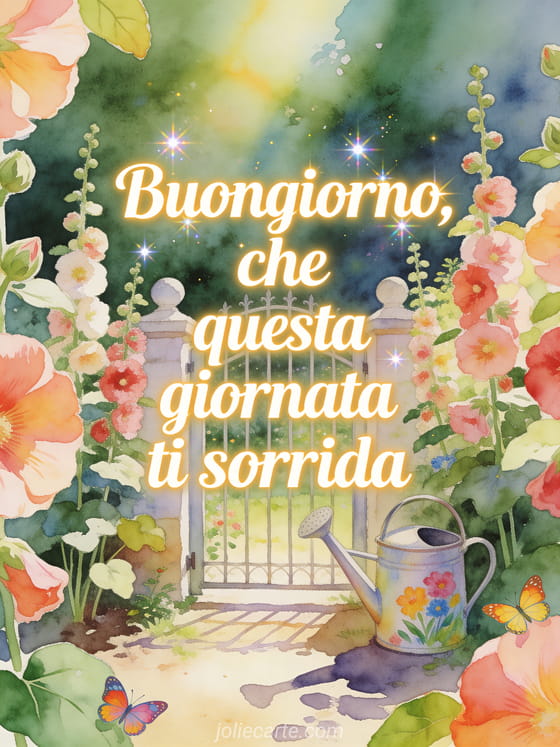 Invia una cartolina gioiosa di buongiorno con scritte ocra soleggiate ad acquerello, un grazioso cancello di giardino circondato da malvarose, un annaffiatoio dipinto e farfalle luminose. Scopri anche un messaggio di buongiorno per mia moglie, un carino messaggio di buongiorno o un messaggio carino di buongiorno con tenerezza al mattino.