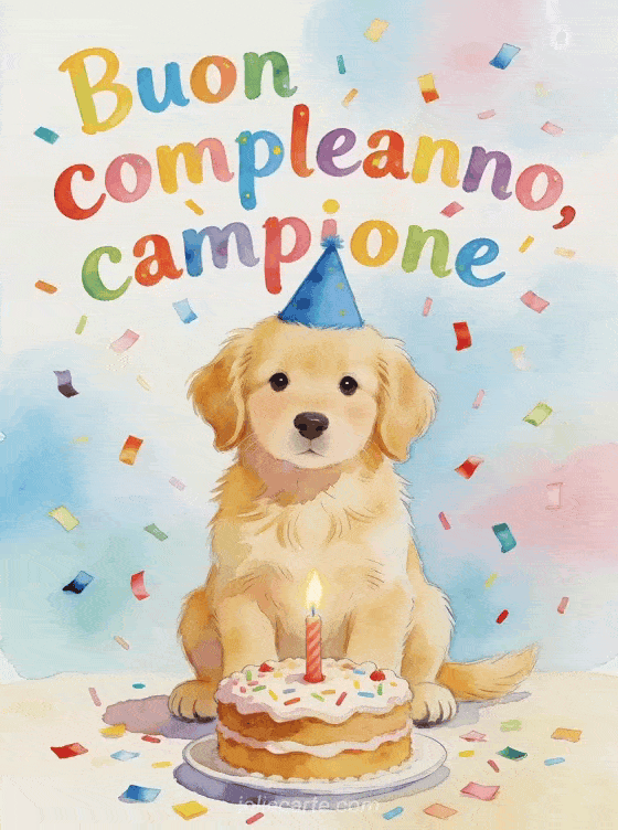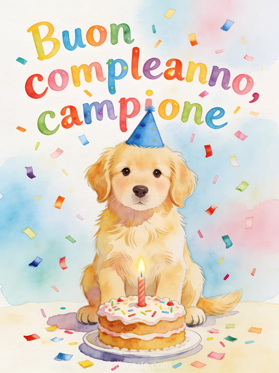 Invia al tuo campione un messaggio di compleanno tenero con un adorabile cucciolo di golden retriever, un cappello blu da festa, una torta con una candela e coriandoli colorati. Scopri anche risata senza gioia, testo di compleanno per mio nipote o compleanno nipote.