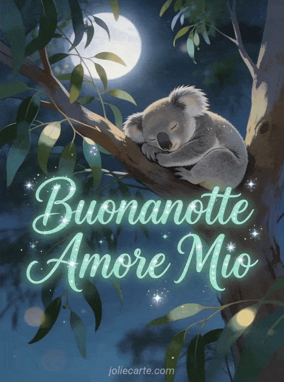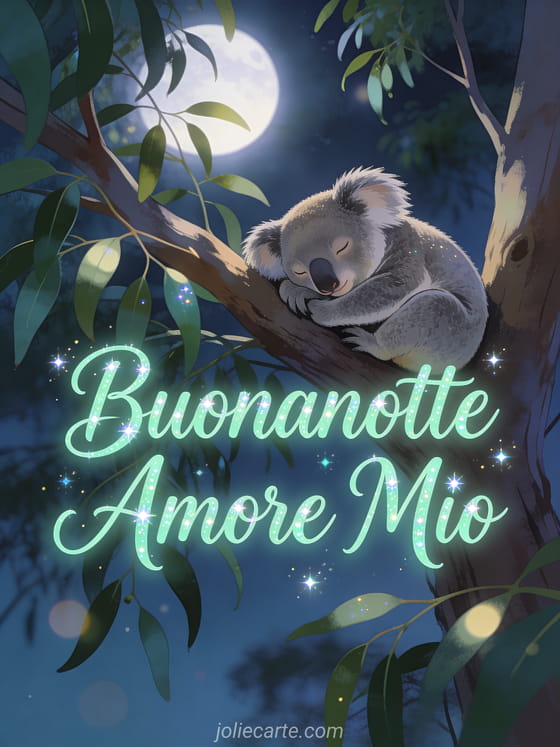 Augura sogni d'oro al tuo amore con questa serena cartolina Buonanotte Amore Mio con un tenero koala che dorme su un eucalipto al chiaro di luna. Scopri anche una cartolina buonanotte cuore o una cartolina buonanotte tenera.
