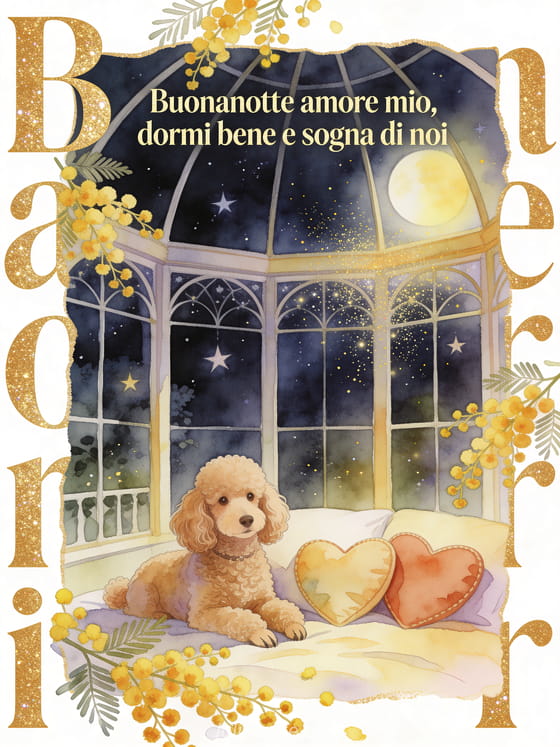 Invia un messaggio della buonanotte per il suo uomo con lettere dorate ad acquerello, un barboncino accanto a cuscini a forma di cuore e mimose in una veranda stellata. Potrebbero piacerti anche questo messaggio dolce della buonanotte, questo messaggio di buonanotte per la sua ragazza o questo bel messaggio della buonanotte.