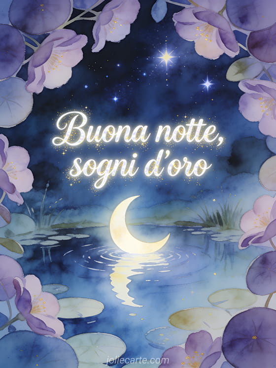 Condividi un messaggio della buonanotte con uno stagno tranquillo al chiaro di luna, una luna crescente riflessa nell'acqua, violette, foglie tonde e stelle luminose. Scopri anche una cartolina virtuale buona notte gratuita, un buonanotte baci biglietto o un messaggio di buonanotte per sua moglie.