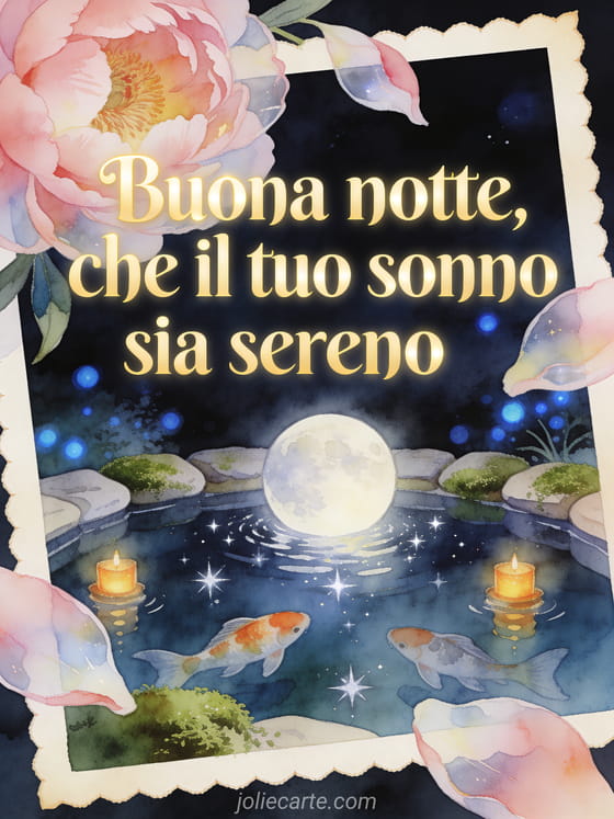 Invia un messaggio calmo di buona notte con scritte dorate, petali di peonia, uno stagno koi al chiaro di luna, candele galleggianti e riflessi di stelle. Scopri anche un buona serata buona notte biglietto, una cartolina online buonanotte o una cartolina virtuale buona serata buonanotte.