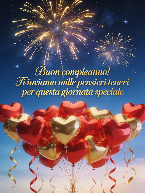Festeggia un compleanno con questa magnifica cartolina gratuita. Palloncini a forma di cuore rossi e dorati con nastri eleganti, fuochi d'artificio dorati che illuminano un cielo blu notte stellato, in un'atmosfera festosa e maestosa.