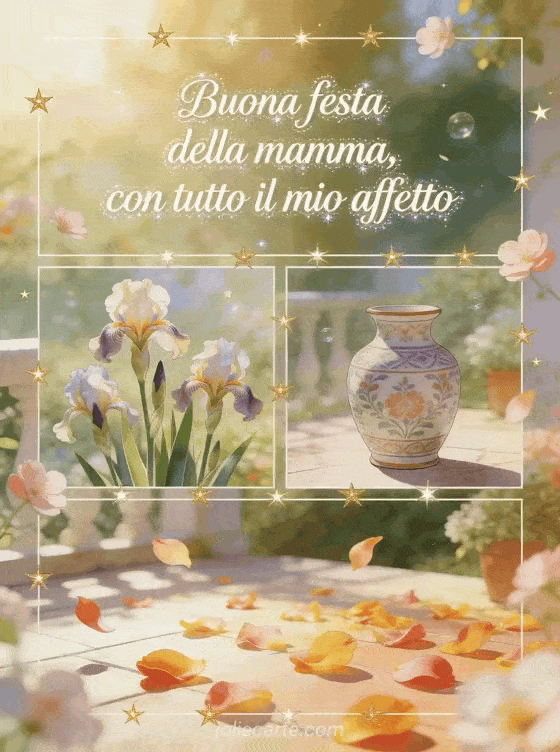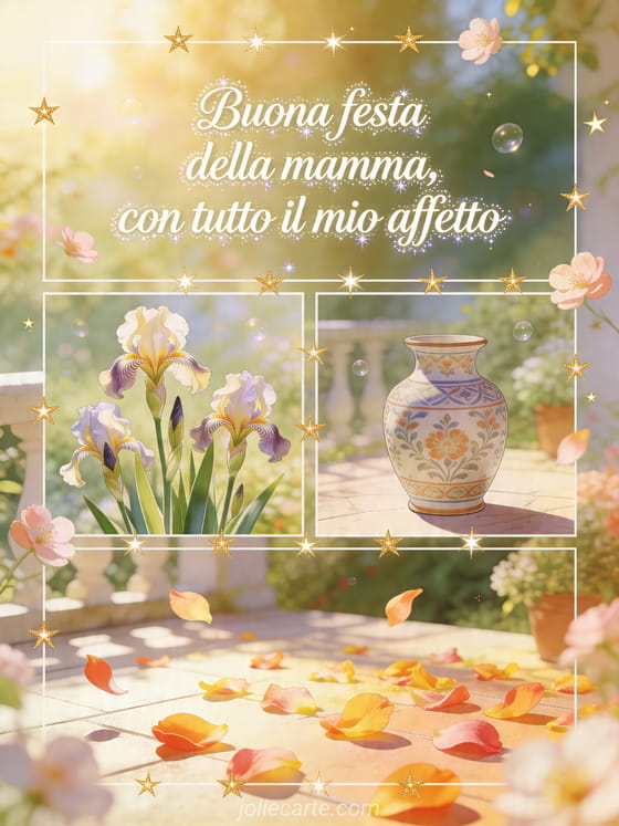 Condividi un biglietto delicato per la festa della mamma in un collage a tre pannelli, con alti iris, un vaso in ceramica decorato e petali su una terrazza assolata. Scopri anche un disegno per la festa della mamma, poesia sulla festa della mamma o poesia d'amore per la festa della mamma.