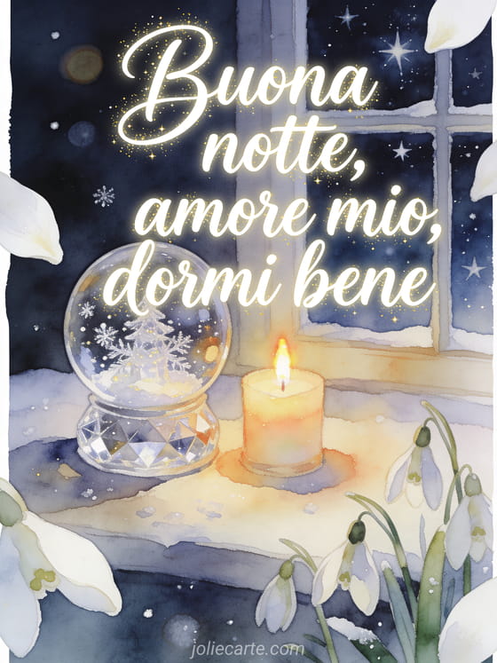 Condividi un messaggio amorevole di buona notte con una palla di neve di cristallo, una candela calda, una finestra stellata e bucaneve. Puoi inviare anche una buonanotte cartolina virtuale, un messaggio carino di buona notte o biglietti buona serata e buona notte.