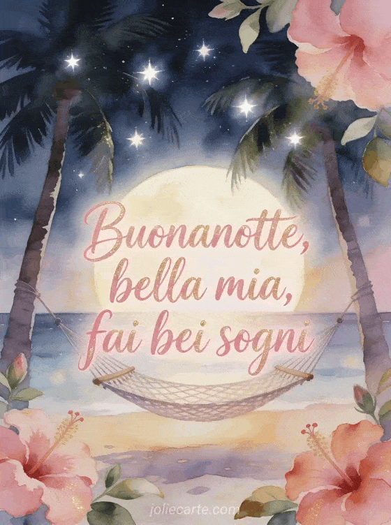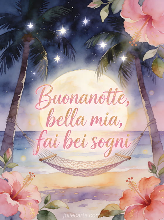 Condividi una dolce notte tropicale ad acquerello con un'amaca al chiaro di luna tra le palme, stelle luminose, fiori di ibisco e caldo bagliore isolano. Scopri anche bel messaggio della buonanotte, messaggio buonanotte per lei o messaggio per dire buona notte al proprio amore.