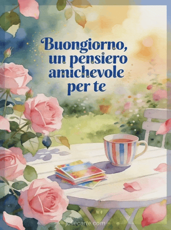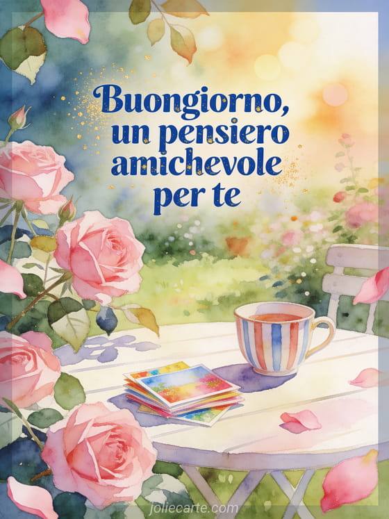 Invia un messaggio caloroso di buongiorno a un amico con lettere cobalto ad acquerello, rose rosa, una tazza a righe e cartoline colorate su un tavolo da giardino accogliente. Scopri anche messaggio di buongiorno per la mattina, cartoline animate di buongiorno o biglietto virtuale buongiorno a te.