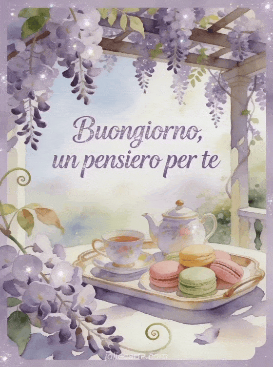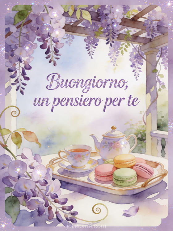 Invia una cartolina amichevole di buongiorno con scritte lavanda tenui ad acquerello, una pergola ricoperta di glicine, un allegro vassoio da tè e macaron pastello nella luce di primavera. Scopri anche una cartolina floreale di buongiorno, una bella cartolina virtuale gratuita di buongiorno o biglietti virtuali gratuiti di buongiorno.