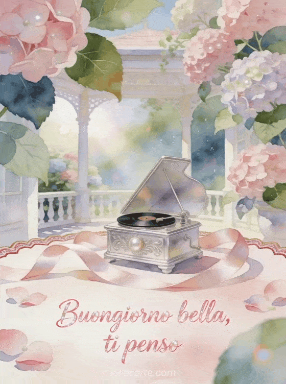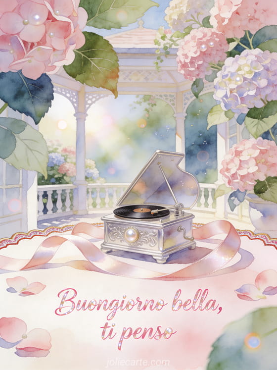 Invia una cartolina romantica con una luminosa veranda, grappoli di ortensie, un carillon d'argento e fiocchi di raso nella dolce luce del mattino. Scopri anche un messaggio di buongiorno toccante, un messaggio di buongiorno mattutino o una cartolina virtuale animata di buongiorno.