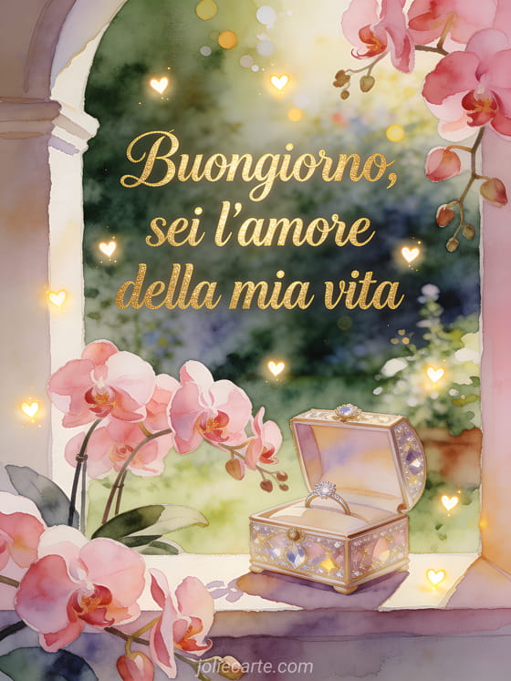 Invia un messaggio di buongiorno commovente per mia moglie con una scena luminosa ad acquerello, orchidee, un cofanetto per gioielli e piccoli cuori brillanti. Condividi questo pensiero tenero per iniziare la sua giornata con amore, e scopri anche un messaggio di buongiorno al suo uomo, un messaggio di buongiorno amichevole o un messaggio carino di buongiorno.