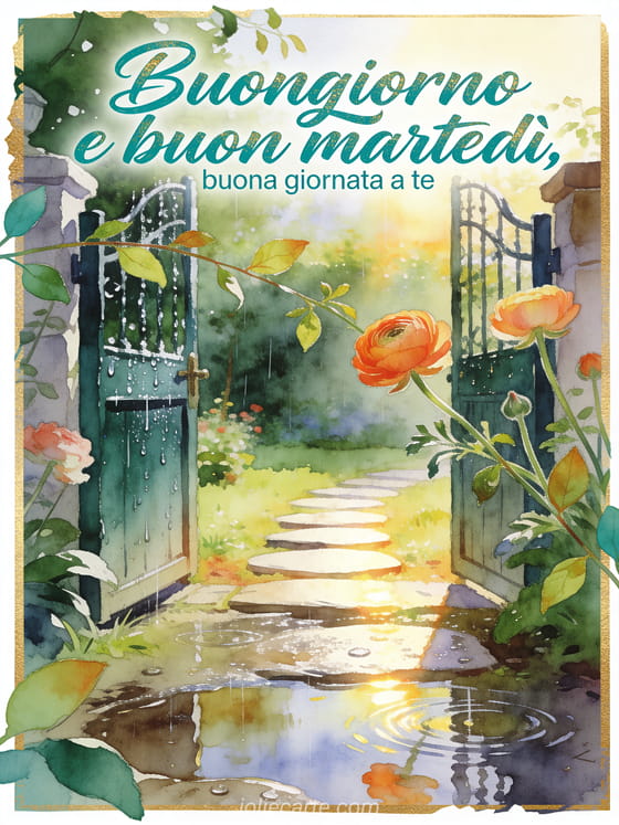 Condividi un messaggio di buongiorno e buon martedì con un cancello da giardino lavato dalla pioggia, pietre illuminate dal sole e ranuncoli. Scopri anche buon martedì al sole gif, un testo buon martedì o un testo per augurare un buon martedì.