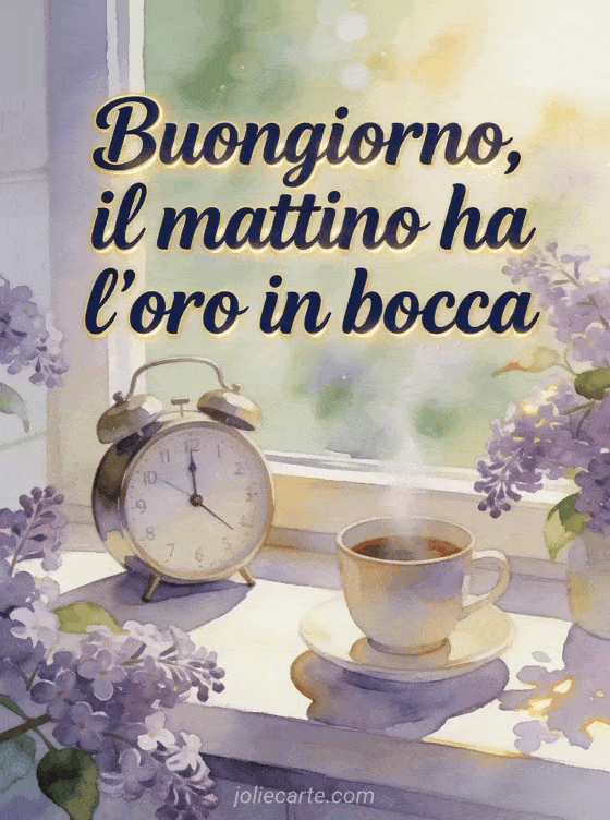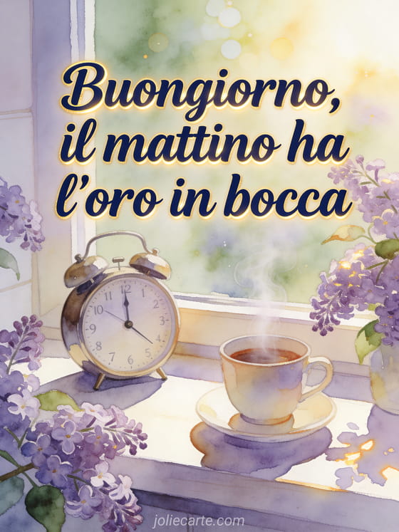 Invia un messaggio di buongiorno mattutino con lettere blu navy nitide ad acquerello, un allegro davanzale di cucina, una sveglia vintage, una tazza fumante e rami freschi di lillà. Scopri anche cartolina virtuale animata di buongiorno, un messaggio di buongiorno per la mia ragazza o cartoline di buongiorno gratuite.