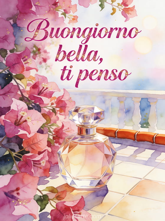 Invia un messaggio romantico di buongiorno per la mia bella con eleganti lettere ad acquerello, un flacone di profumo e bouganville luminose. Scopri anche messaggio di buongiorno commovente per mia moglie, messaggio di buongiorno per lui o messaggio di buongiorno commovente.