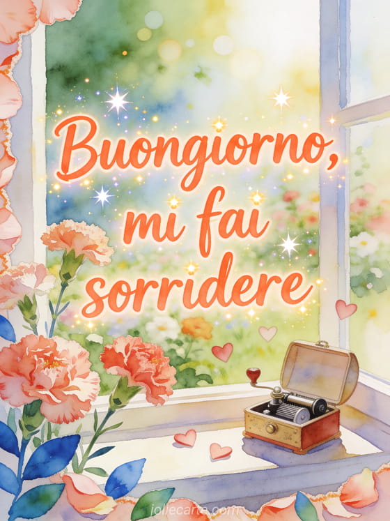 Invia un allegro messaggio di buongiorno per la tua crush con lettere corallo ad acquerello, garofani, un piccolo carillon e coriandoli a forma di cuore. Scopri anche messaggio di buongiorno per la mia bella, buongiorno gif divertente o fiori di palude.